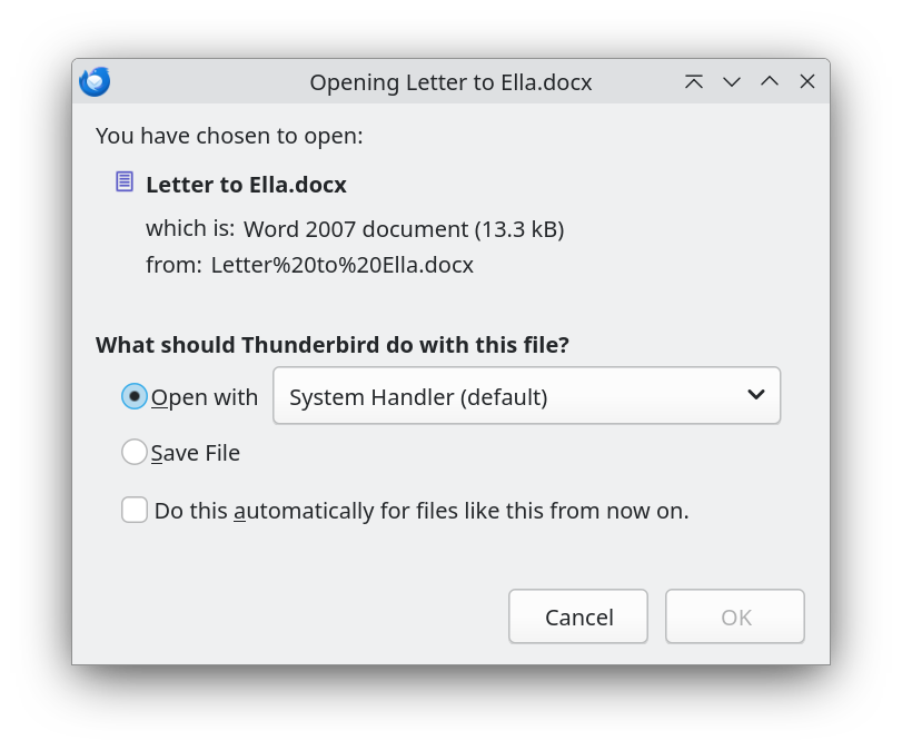 Is the document correctly identified in the message body for a handler to be determined. The file name appears to indicate that the attachment may be a word document. However unless the media type is correctly set in the email, there is no definitive file type to recommend an appropriate helper application.