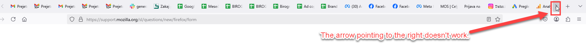kar naenkrat se ne morem več pomikati po zavihkih v desno, mi kaže vedno prvo stran odprtih zavihkov in ob kliku na puščico za pomik v desno po zavihkih me vedno usmeri nazaj na prvoten pogled. Imam okoli 50 zaviskov odprtih in mi kar naenkrat kaže samo prvih nekaj odprtih, puščica za pomik v desno ne dela.