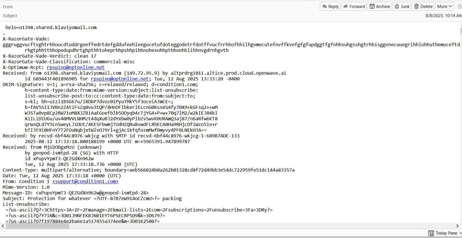 Since midday on the 10th, one of my 2 email clients shows plain text instead of HTML. My optonline email is the one in question. It no longer shows a sender or subject, and the body of the email received is in plain text. I have attached an example. Any help would be greatly appreciated. Thanks. Rick.