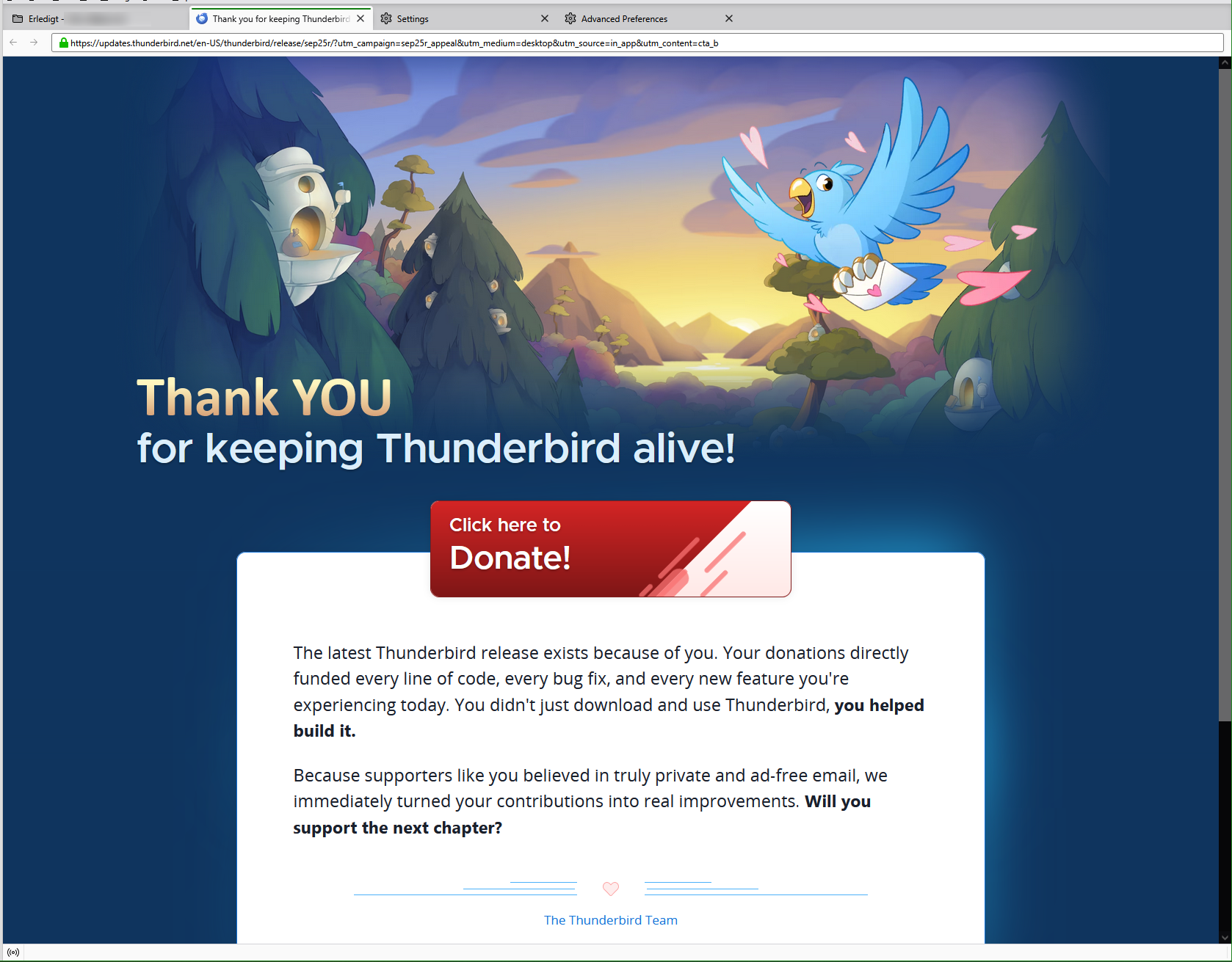 How do I disable the donation webpage that opens (in Thunderbird) automatically?
