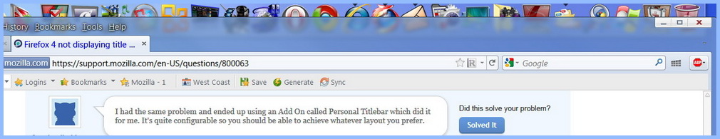 Firefox 4 not displaying title bar shell correctly. Transparent behind upper tabs. No close, open or Min, display flickers but unusable. Have graphic.