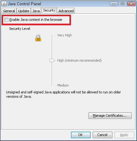 Windows Control Panel > Java > Security tab > uncheck Allow Java content in the browser