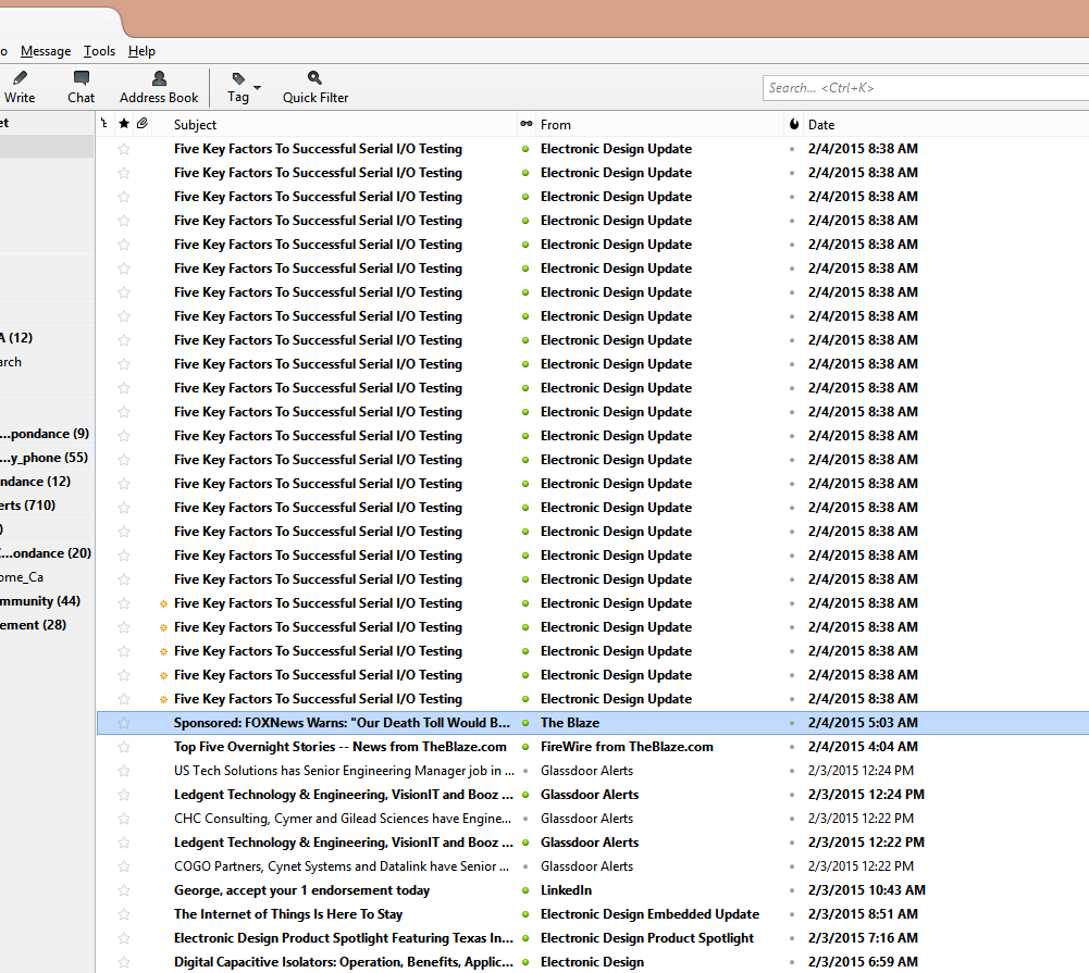 Thunderbird has been working great for almost a year. I had approx 30 emails coming into my inbox (i saw them on my smart phone) and after about 3 email downloads it downloaded "Five Key Factors..." time stamped 2/4/2015 at 8:38 AM and stopped. When I hit "get messages" again it downloaded the same email. Now every time I hit "get messages" it downloads one copy of the same "Five key Factors..." and nothing else. I suspect TB got corrupted during the download process. it may also do it automatically during each download refresh. System info 32GB RAM, 2.25 TB storage, i7 4770K, Wifi (60Mbps) download.
