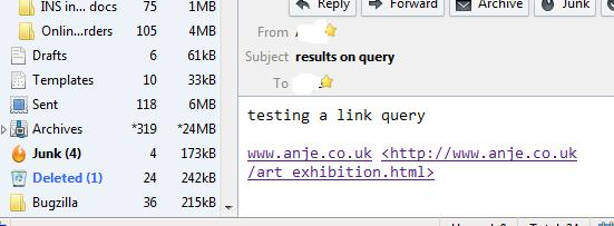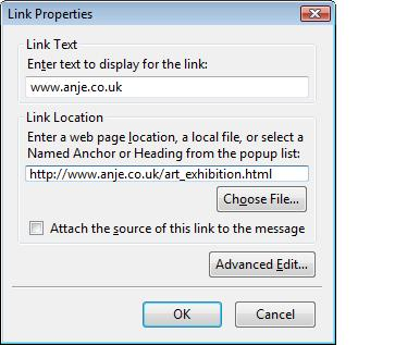 Open a new Write message Type something in content area and now to insert a link. Insert > Link 'Link Text' enter: www.anje.co.uk 'Link Location enter: http://www.anje.co.uk/art_exhibition.html See image below click on OK to insert the link.