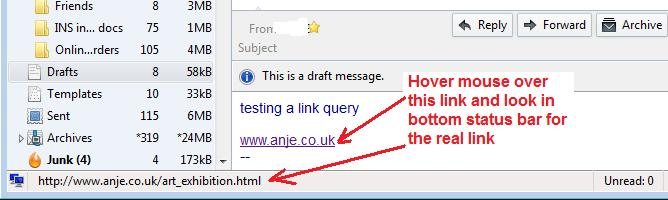 Save as 'Draft select draft email so it shows in lower Message Pane. I will see www.anje.co.uk as a blue link. If I hover over the link and look in the Status Bar, it will show that the link is actually to http://www.anje.co.uk/art_exhibition.html see second image below