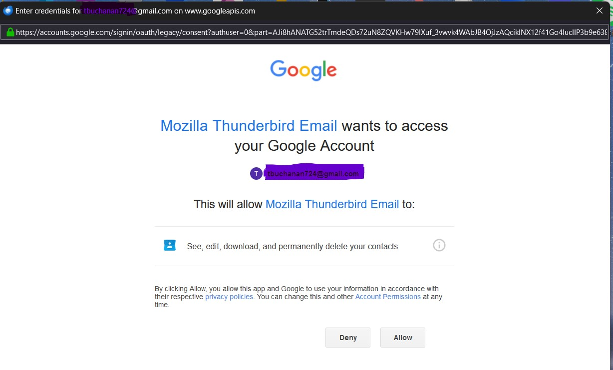 However, starting at around the end of July or beg of August, I have been seeing the following behavior: At certain points of the day including at startup, I get a set of pop-up windows from Thunderbird asking for access to my google account. I don't understand why thunderbird would want me to provide my google credentials when the email account that I'm using thunderbird for is neither an exchange (outlook.com or live.com) or my gmail.com account. It's my professional email address that is hosted by a third party. And when I click the deny button on both windows, it still pops up at some point during the day. It was annoying as 'heck' when I was with a client as it kept popping up. Don't know what I've done but I would like to know how to stop this popup window activity! I'll also add that if I close down thunderbird and then restart, the windows pop up almost instantly. So, any help would be welcome! I've attached screenshots of both windows with my email addresses highlighted out so anyone can see what I'm dealing with.