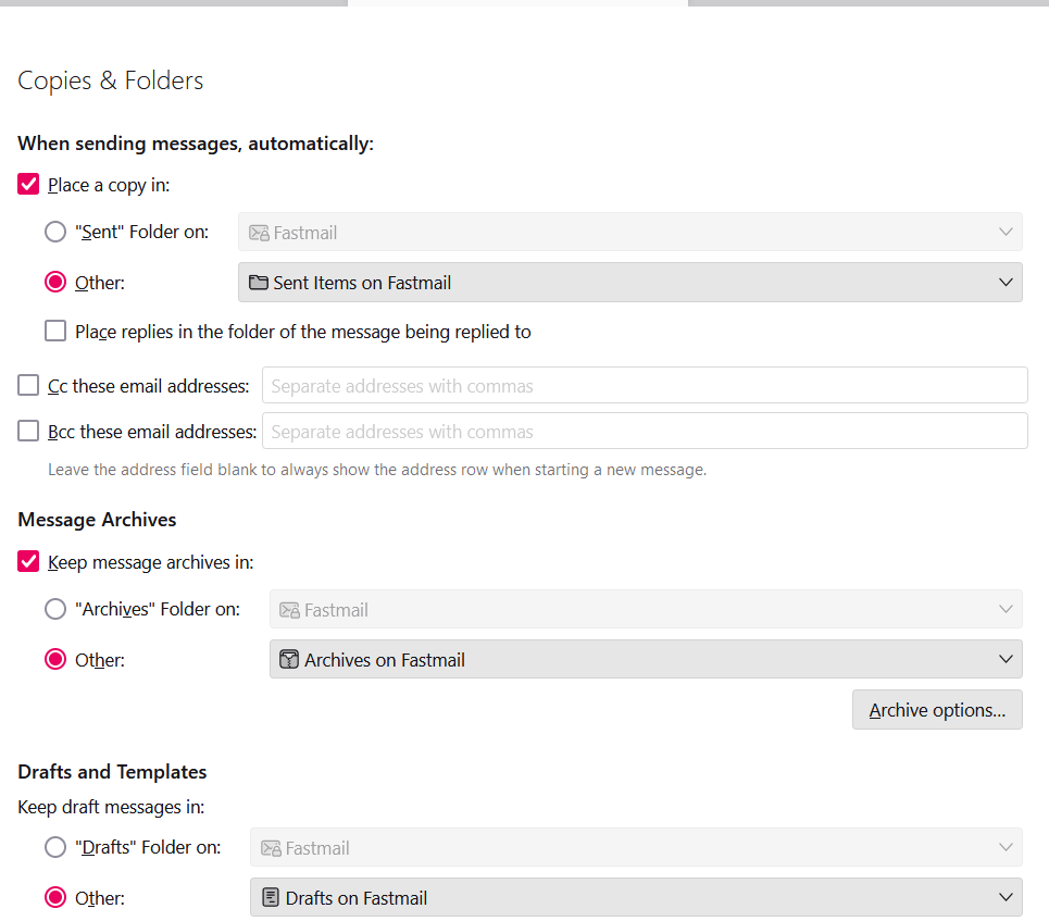I went drafts to be saved in my servers 'drafts' folder and emails that I've sent going into my server's 'sent items' folder. They keep being saved in Local folders-drafts and Local folders - sent . I've tried to change that without success.