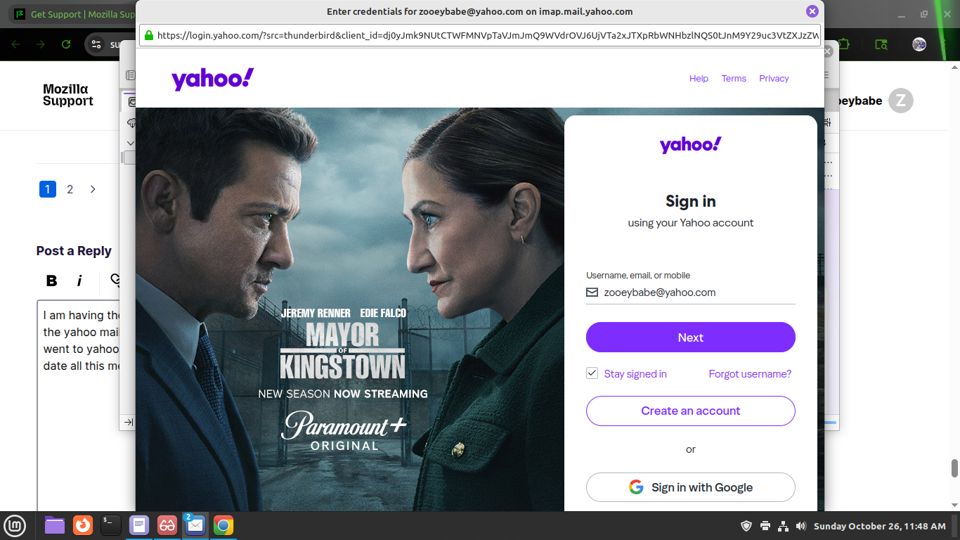 I am having the same problem. When I open Thunderbird it automatically opens my chrome browser to a link to the yahoo mail sign in screen. When I sign in, it takes me to yahoo mail. I don't know how to fix it and when I went to yahoo mail I saw on one page that it had thunderbird recognized but it said it was not in use. And the date all this messed up was 09/25/25.