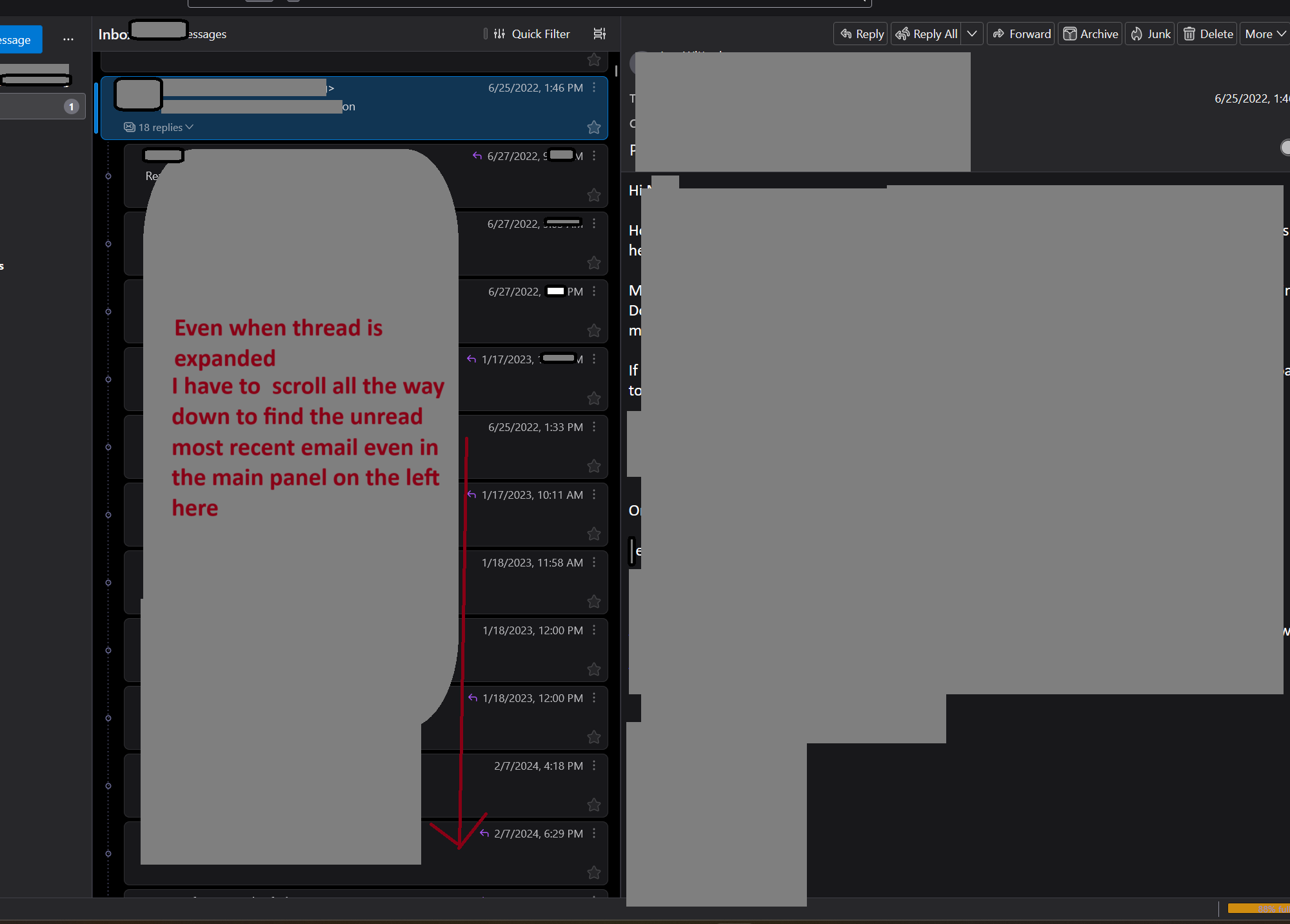 When Selecting an Unread Email, Make it Open that Email instead of just the Huge Thread? Or Display Most Recent Email At Top At least?