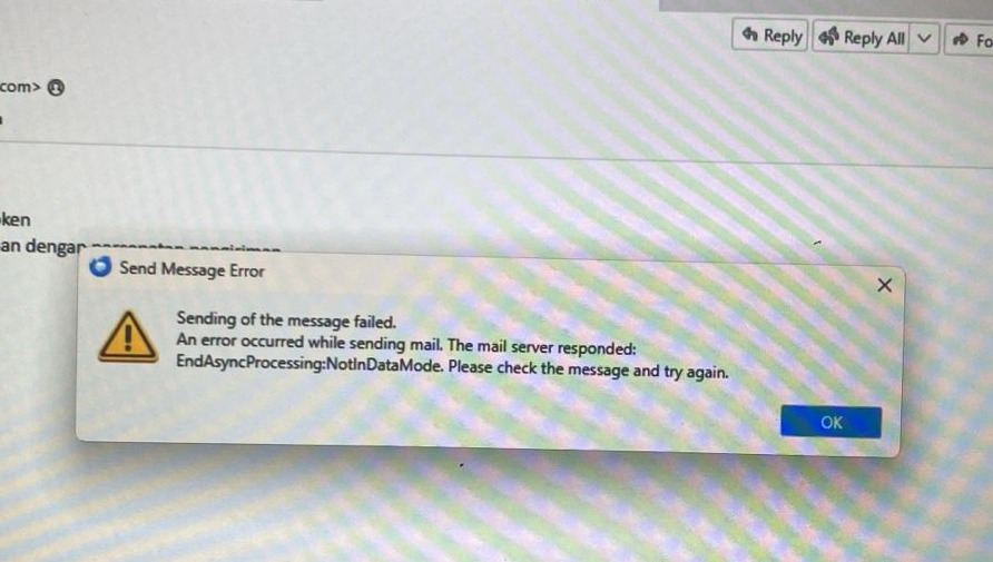 Sending of the message failed. An error occurred while sending mail. The mail server responded: EndAsyncProcessing:NotInDataMode. Please check the message and try again.