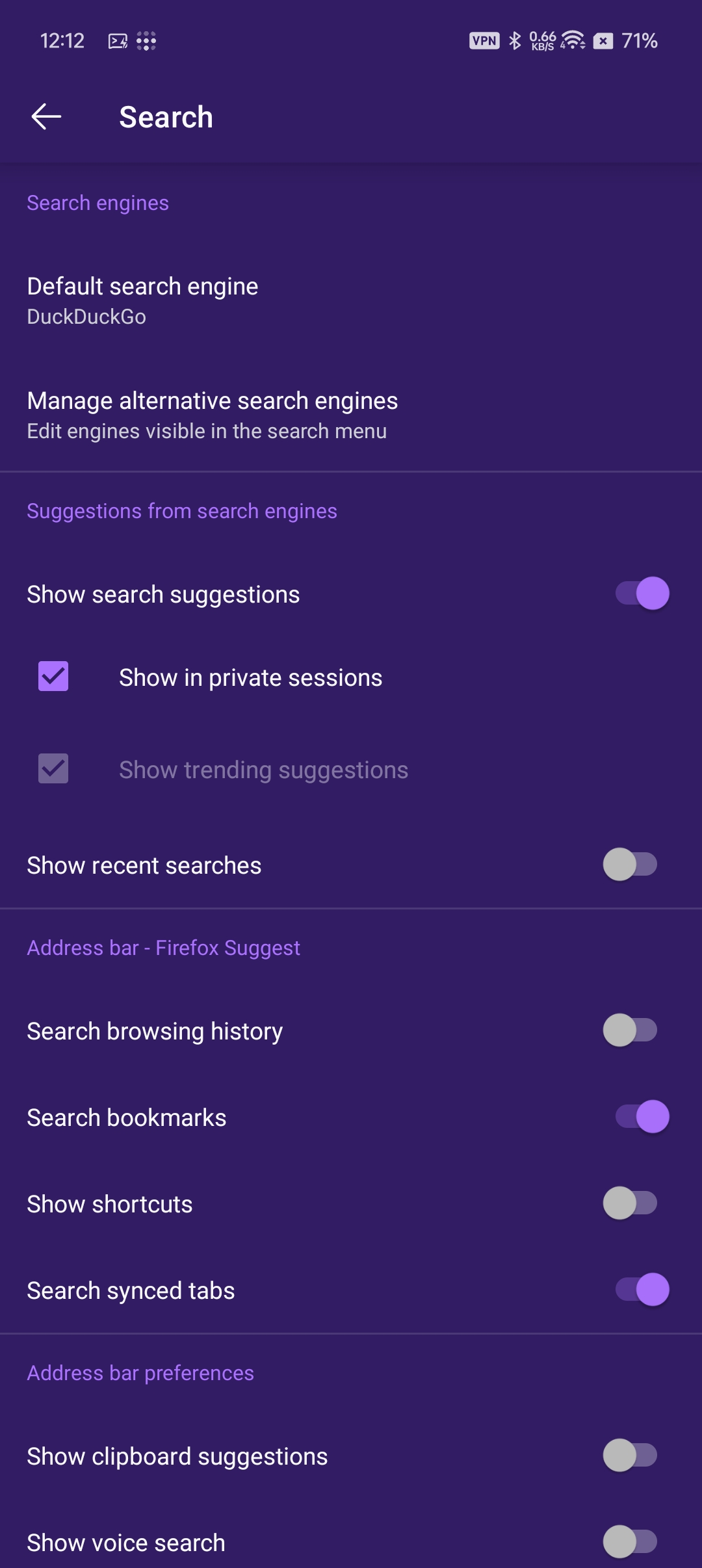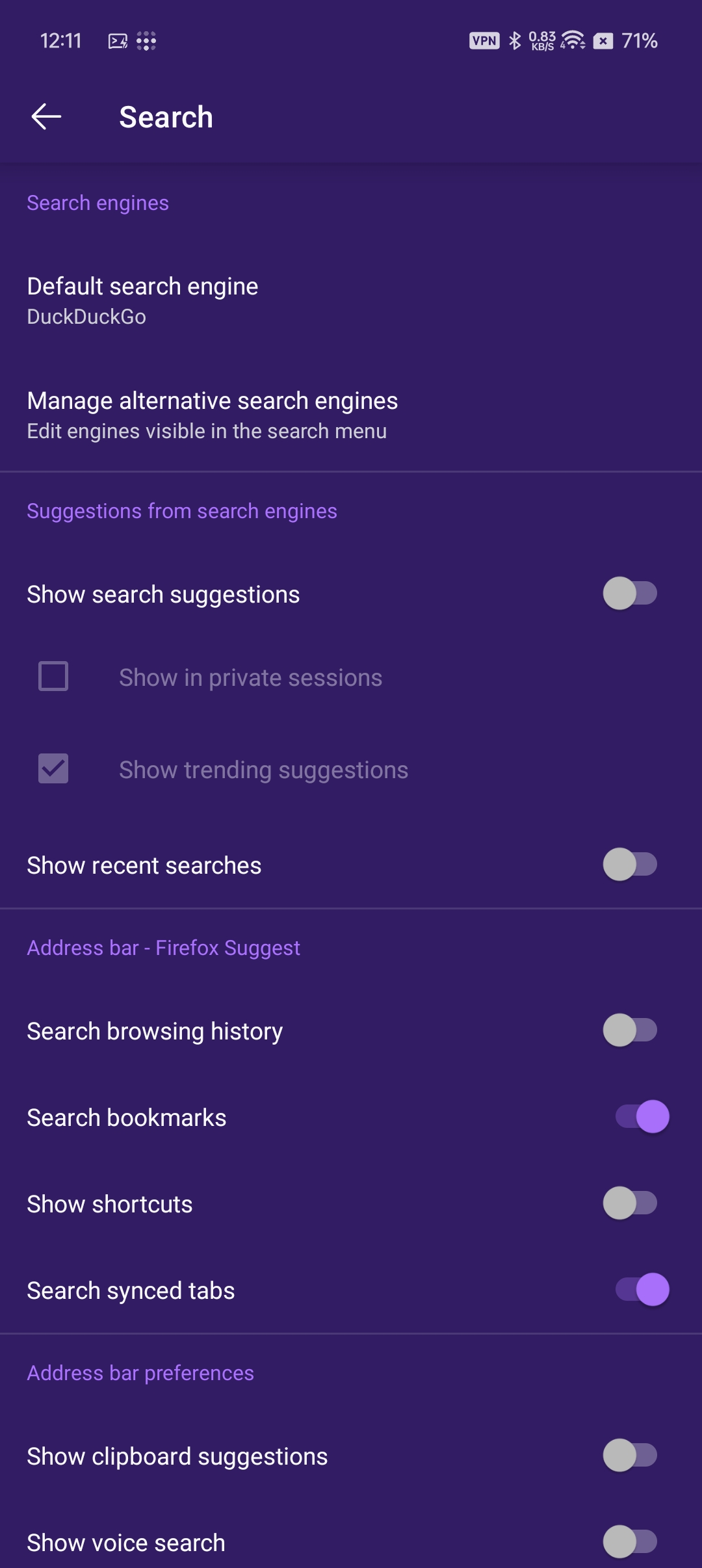 So right now to search from Address Bar, I have to manditorily Turn ON Show Search Suggestions Option, which starts showing Trending Search Suggestions (which is very annoying and useless for me). Kindly fix this and provide options where user can Enable Search Suggestions for Local Bookmarks or Synced Tabs without forcing user to enable Trending Search Suggestions from Search Engines.
