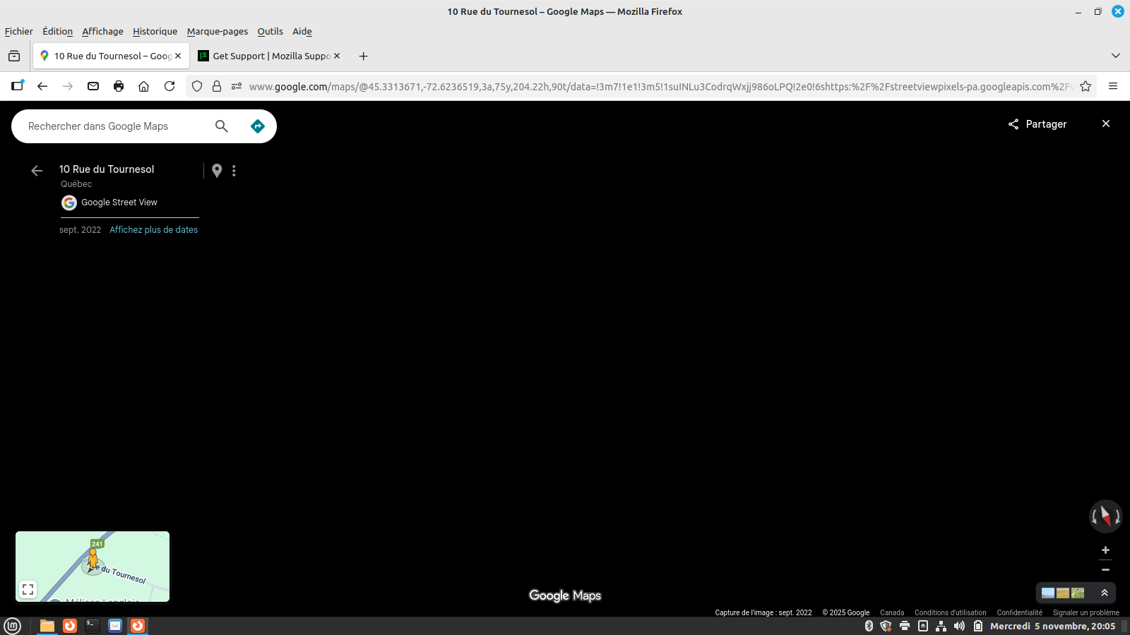 Hello. I am using Linux Mint 21.3 cinnamon and Firefox 144.0.2 When I use Google maps and the yellow small pointer (cartoon) to go on a specific street, the window come black when shifting to street view. My only extension is disabled, hardware acceleration unchecked, cache cleared and cookies cleared. I have made fresh install and nothing help. Troubleshooting mode allow street view to work fine but normal mode don't work. Google chrome work good. Chromium work good. And finally, Firefox work ok on my Linux mint LMDE 6.