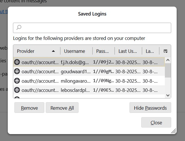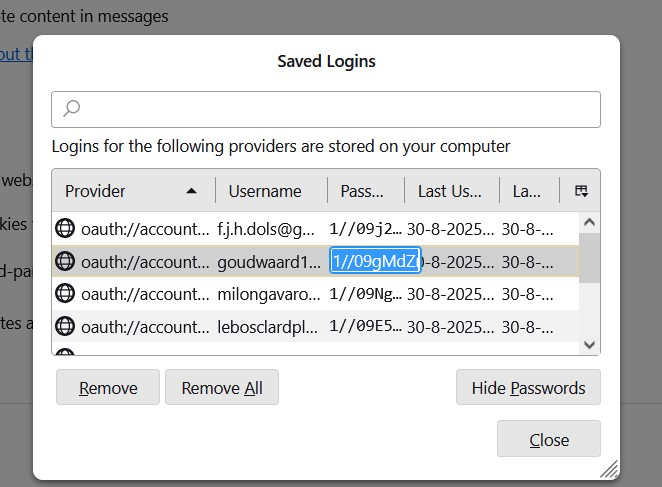 Hi, I can sign in and all mail accouns work fine. However, i USED to be able to go to passwords then chose show passwords and (after typing my global passsword for TB) I would see my real passwords (not the long string of letters) for each account.