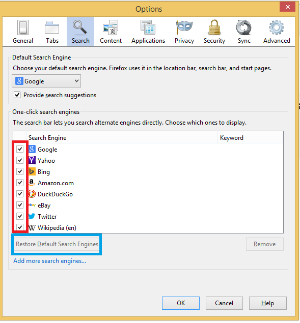 Either check all of these marked on red color. Or press "Restore Default search engine" button marked on blue color.