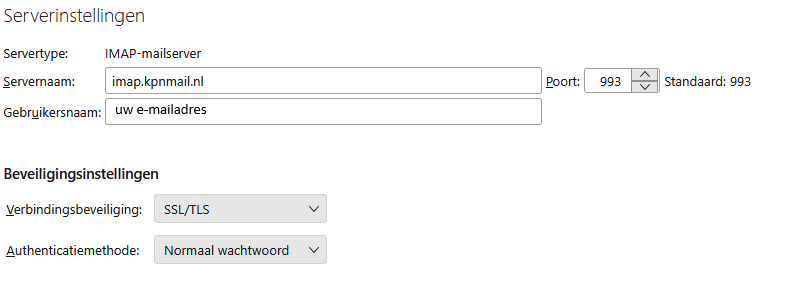 Daarvoor gelden de volgende instellingen: IMAP-instellingen Inkomende server: imap.kpnmail.nl (SSL aanvinken en poort 993 invullen) Gebruikersnaam: KPN-e-mailadres Wachtwoord: KPN-wachtwoord