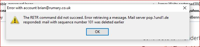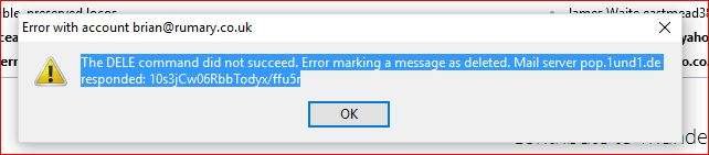 I am downloading emails but when I get to an email from a certain correspondent, with a large file(s) or PDF(s) attached, the downloading crashes with the following error message:- "The DELE command did not succeed. Error marking a message as deleted. Mail server pop.1und1.de responded: 10s3jCw06RbbTodyx/ffu5r" (see also attached partial screenshot)