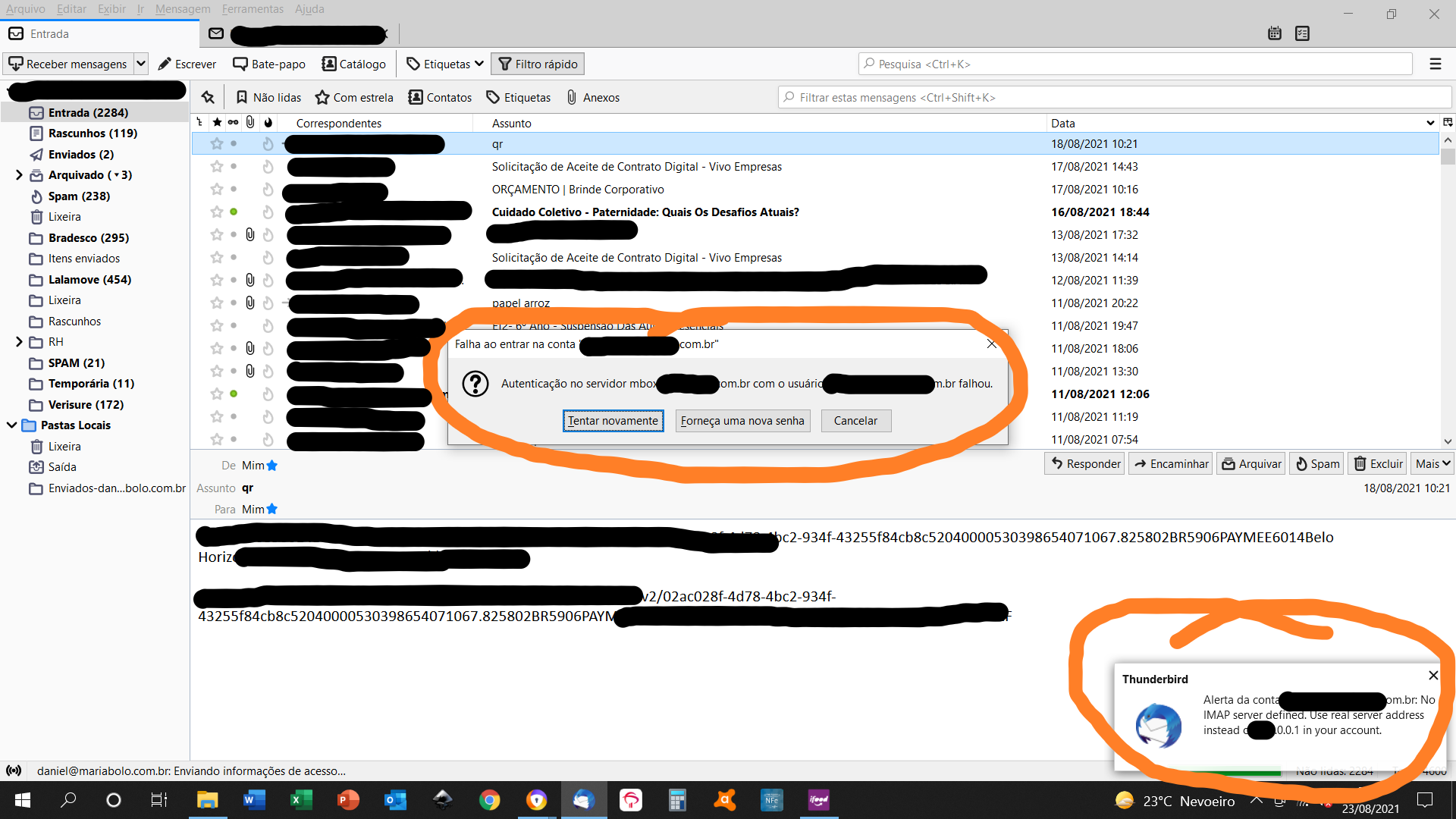 Olá! O Thunderbird funciona bem 95% do tempo, mas de tempos em tempos não sincroniza e mostra mensagens de erro. Normalmente volta a funcionar depois de um tempo, sem eu ter alterado nada. Obs: as configurações de servidor imap de entrada e saída está ok, já verifiquei. Porém desta vez parou de sincronizar e não volta mais ao normal. Uma mensagem de erro pede pra eu fornecer nova senha, mas a senha está correta, tanto que se acesso pelo webmail consigo entrar normalmente. Outra mensagem no canto inferior direito informa que eu devo usar um "servidor IMAP real" ao invés de um endereço IP ***.0.0.1