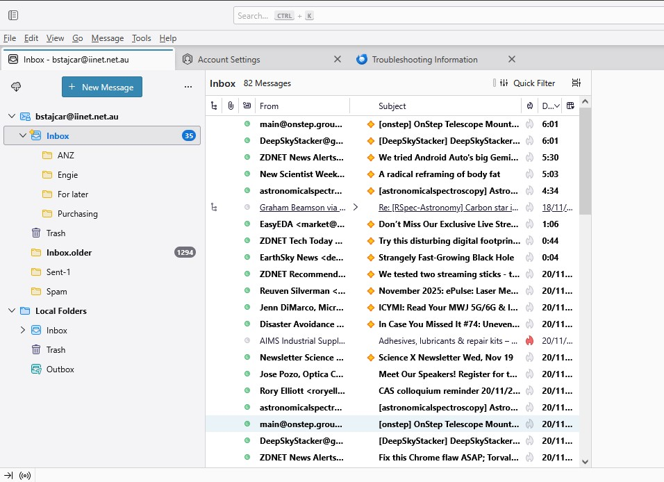 3) After starting TB, I saw the number of emails in inbox (as per attached, the number was >1500 emails ), but I could not see any subfolders. Also I noticed that the number started to decrease (!!) It seems TB was erasing the content that was supposed to be displayed...