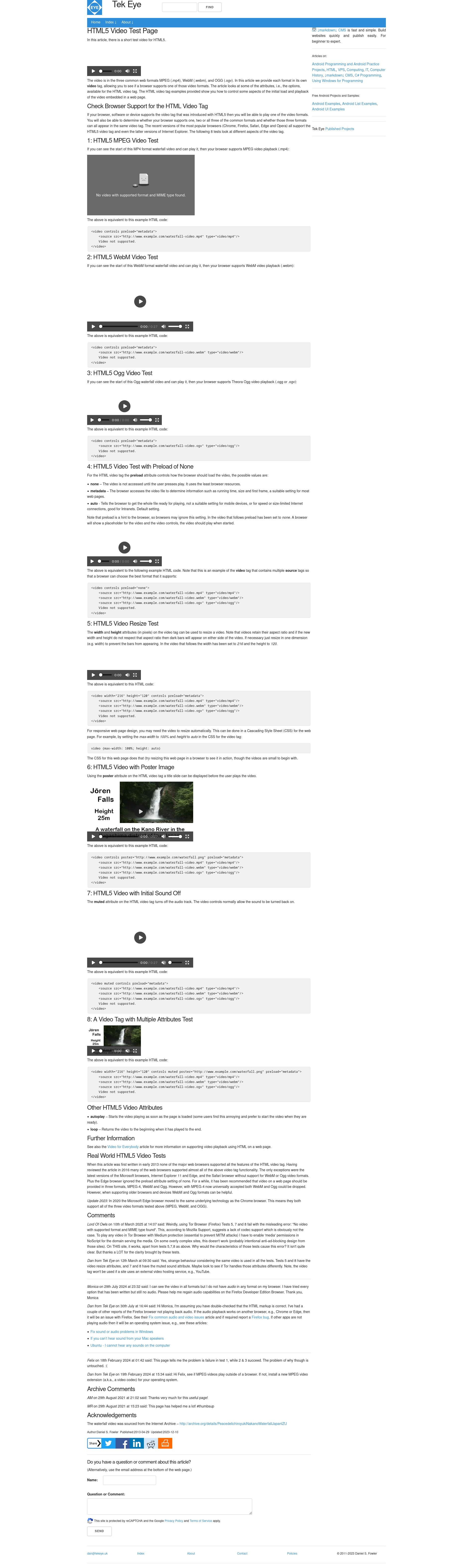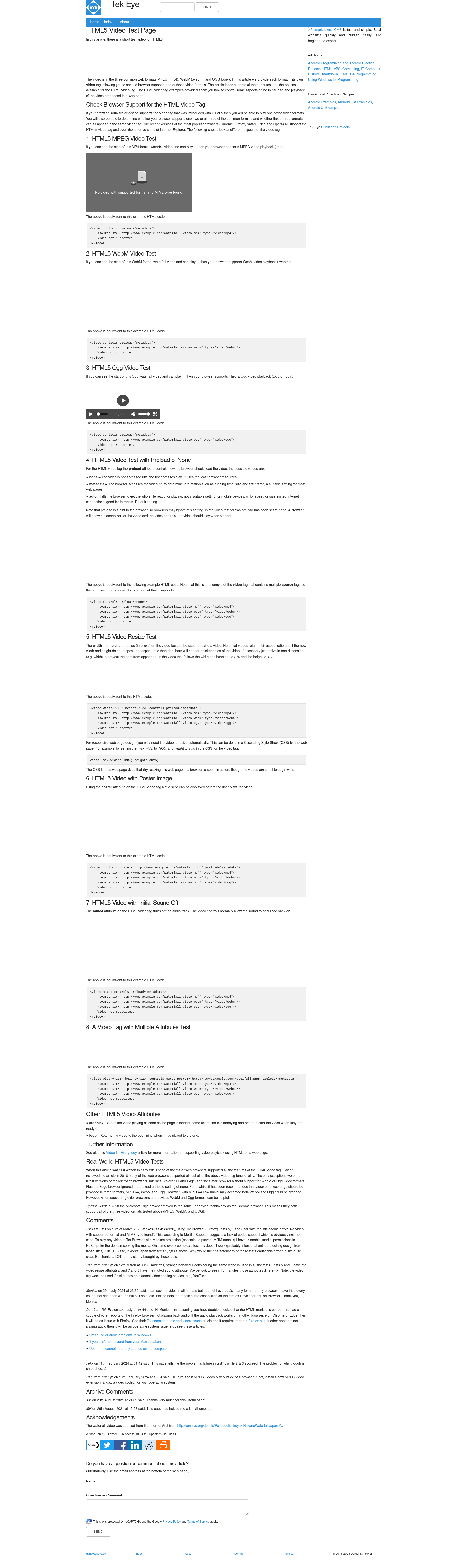 I used this Article https://support.mozilla.org/en-US/kb/audio-and-video-firefox and the links it contains to debug without any success. None of these samples play. just shows supported format/mime error https://test-videos.co.uk/bigbuckbunny/mp4-h265 At this test website 1. and 3. example won't play. I provided a screenshot before and after trying to click play on all the examples. https://www.tekeye.uk/html/html5-video-test-page