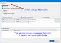 I already gave an example of saving email addresses. You can see there are other options, such as words in subject or in body. I suggest you write down you initial needs and set up multiple filters to see if that works for you.