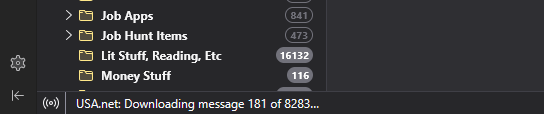 Here is the issue: Out of nowhere, a few months ago, when I tried to download my USA.net email, it would stop after 100-200 emails. Also, it would NOT "register back" to USA.net and show the downloaded items as "gone" (I checked my settings; I am NOT leaving email on the USA.net server).