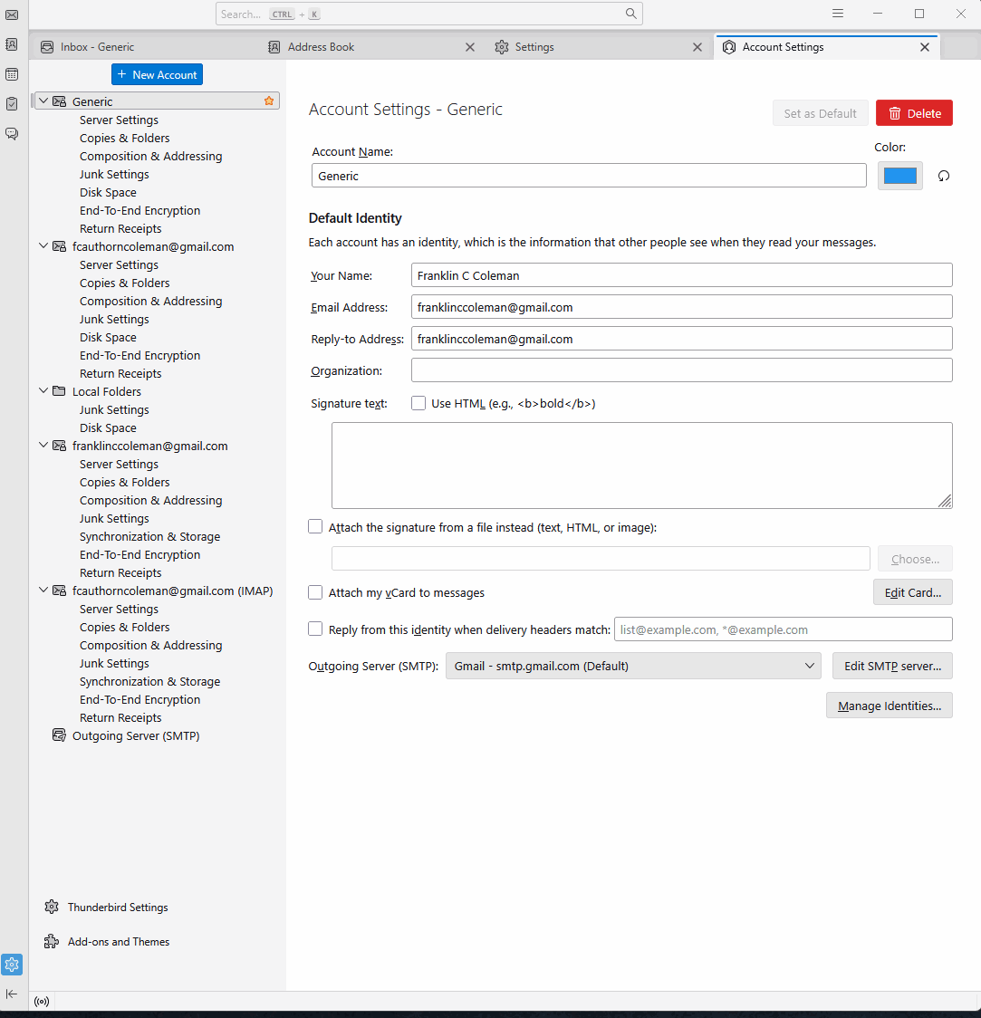 With massive lack of understanding of what I'm reading, I did look a bit deeper into the Account Settings. Specifically at the "Server Settings" under each account. I notice that for "Generic" and for "fcauthorncoleman@gmail.com", the "Server Name" is "pop.gmail.com" and the "Port" is "995"; while for "franklinccoleman@gmail.com" and "fcauthorncoleman@gmail.com (IMAP)" the "Server Name" is "imap.gmail.com" and the "Port" is "993". Are those values reasonable? I do not see any instance of a "franklinccoleman@gmail.com" account with a POP Server. Should there be one? Should I (somehow) add one in?