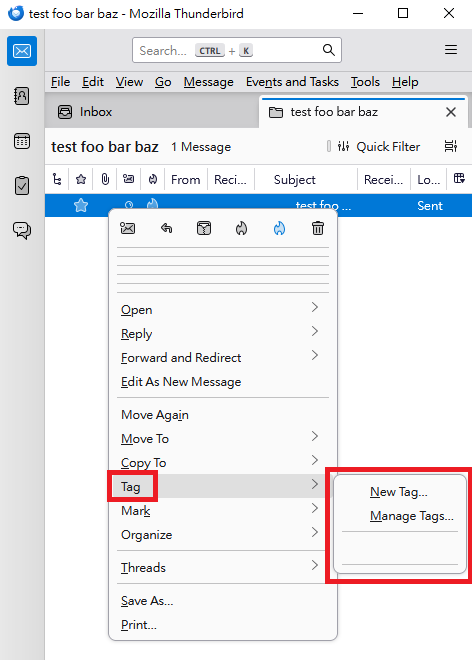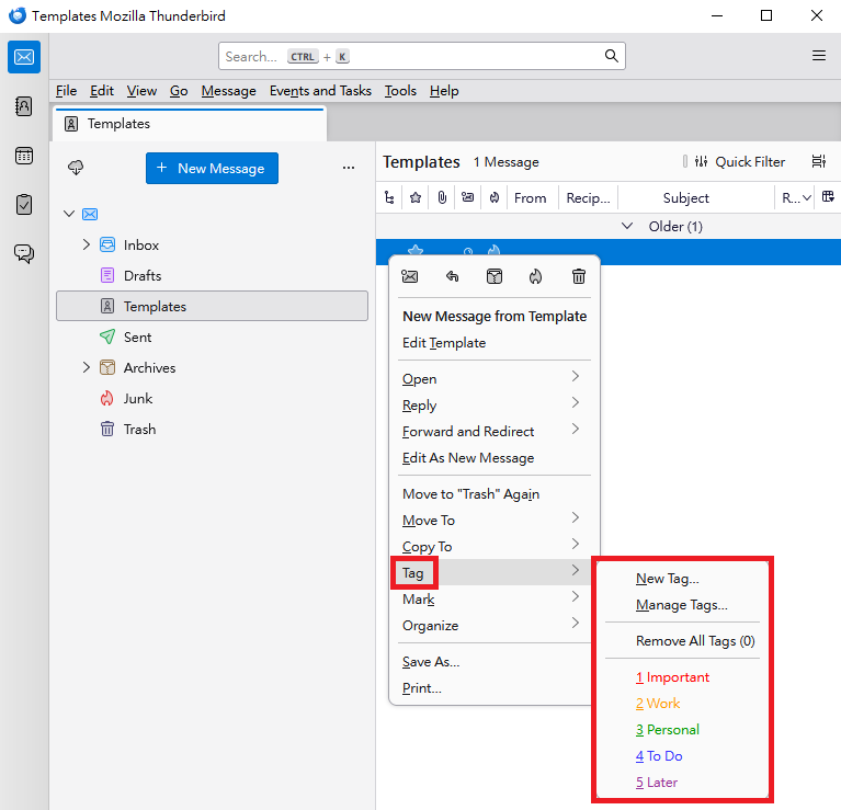If I right-click a message in the Message List Pane of a regular folder (such as the "Inbox" folder or "Templates" folder), the pop-up context menu displays correctly: There are no redundant dividers, and the submenu of "Tag" is complete. (Please see the third attached image.)