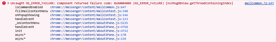 Uncaught NS_ERROR_FAILURE: Component returned failure code: 0x80004005 (NS_ERROR_FAILURE) [nsIMsgDBView.getThreadContainingIndex] mailCommon.js:647