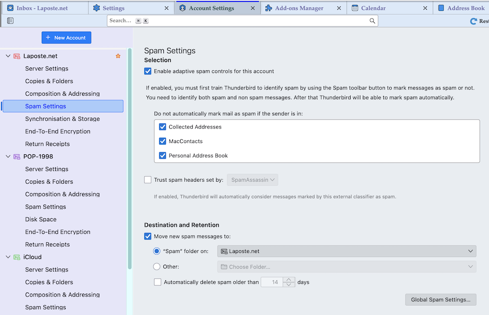 R-click on the account name in the folder pane > Settings which will open the Account Settings tab. In this tab click on Spam settings (image) ...