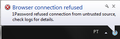 The connection refused message means 1Password is unable to validate your browser's code signature. This is a security measure to make sure the browser you're filling in is what it claims to be and not a malicious process masquerading as your browser.https://discussions.agilebits.com/discussion/comment/473343/#Comment_473343