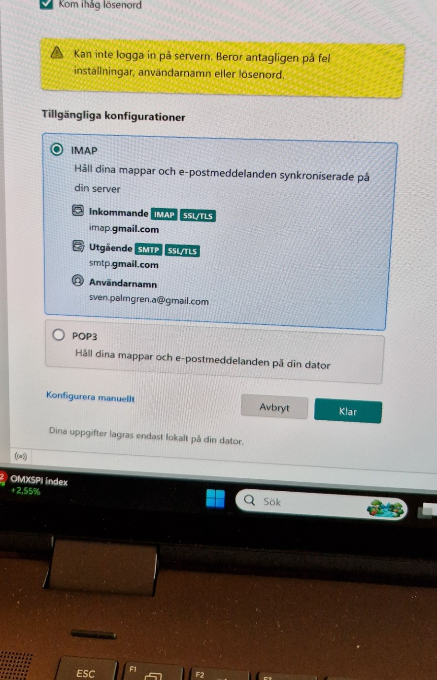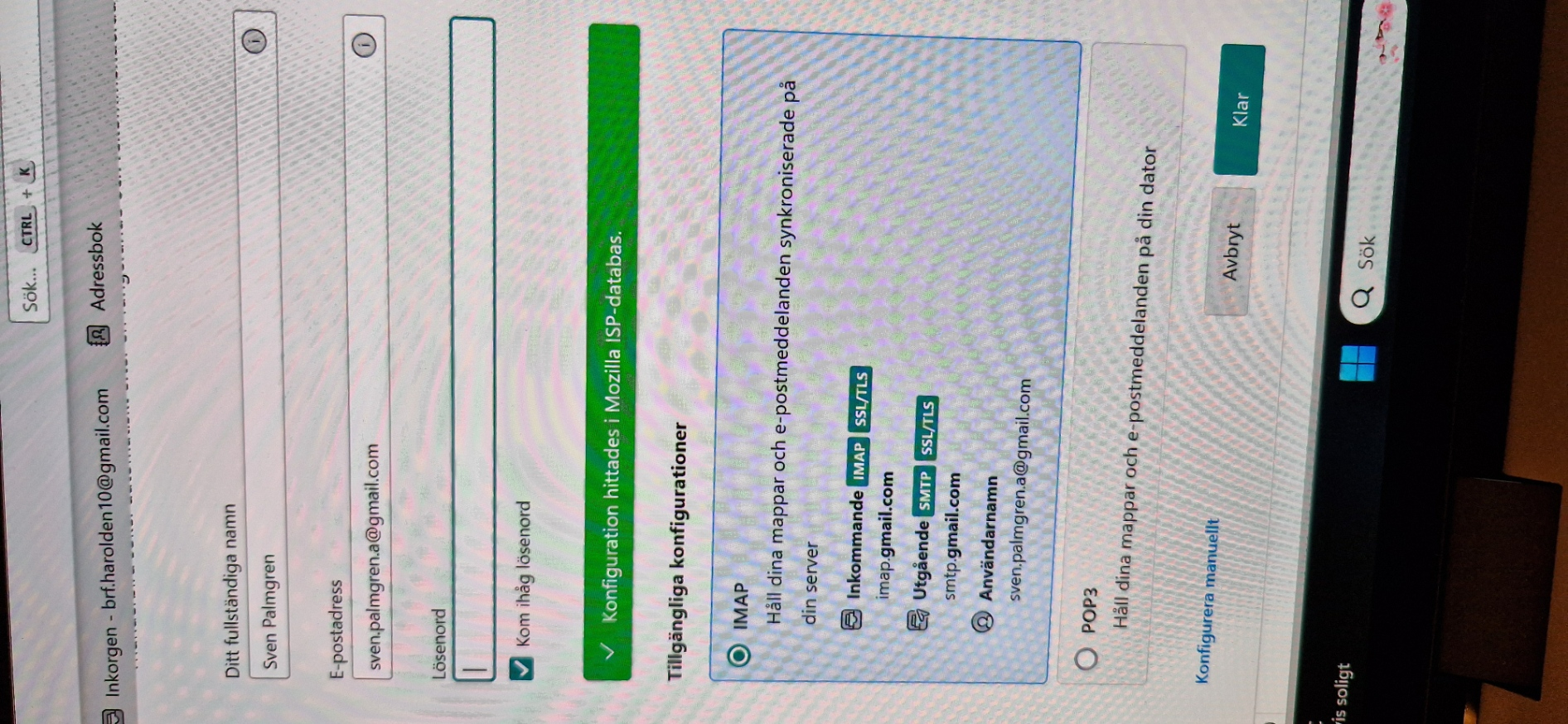 My emailprovider is gmail I have two other email addresses with the same settings. All three worked in my old computer(W10) and in the thunderbird app in my mobile phone. I have even changed the password.