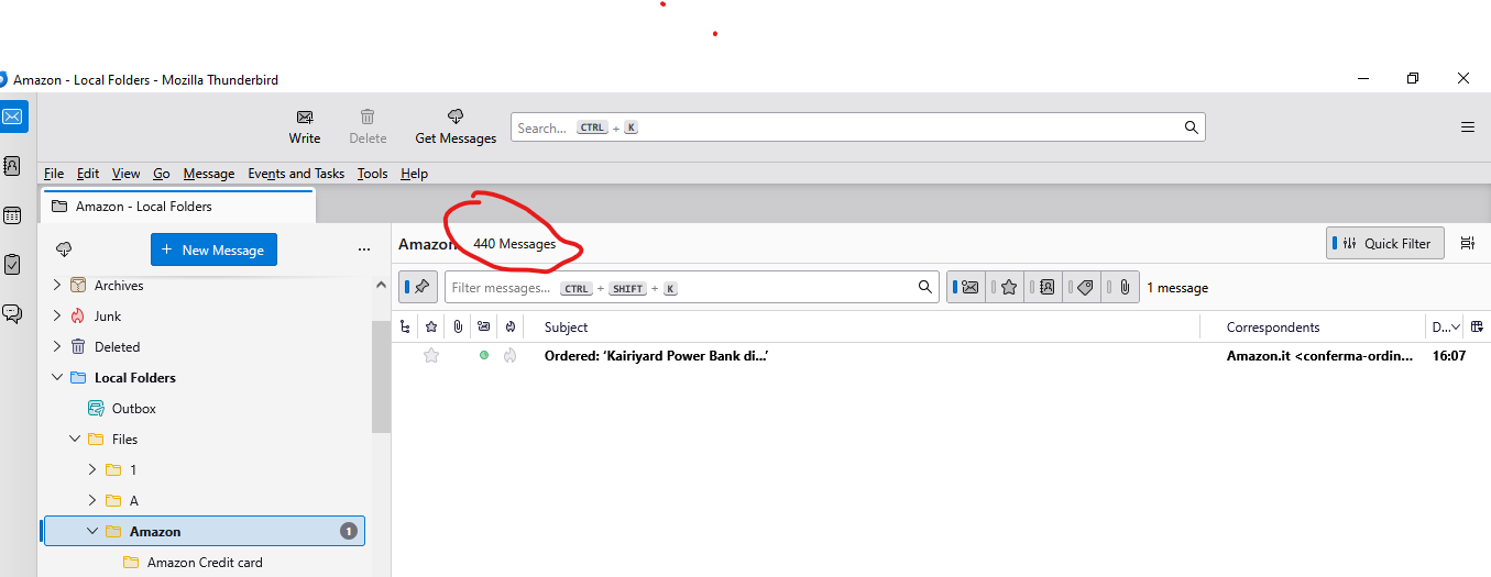 After installing TB on new machine(s) everything in the profiles looks normal. The folder names in the local folders are all there, as are the subfolders, and the folders all show the correct count for the number of messages in each folder and subfolder. But the actual messages are missing completely. All of them. I can save new emails to the local folders, and they appear. Example below, one saved message but the folder says there are 440. I have backups of the profile that are all showing the same problem. I guess that somehow there is a problem with pointers?