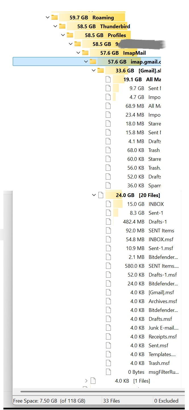 TreeSize free app tells me space through Users...AppData...Roaming...Thunderbird...ImapMail...Imap.gmail.com 57.6GB after which it seems to double the size of the actual data, like this: