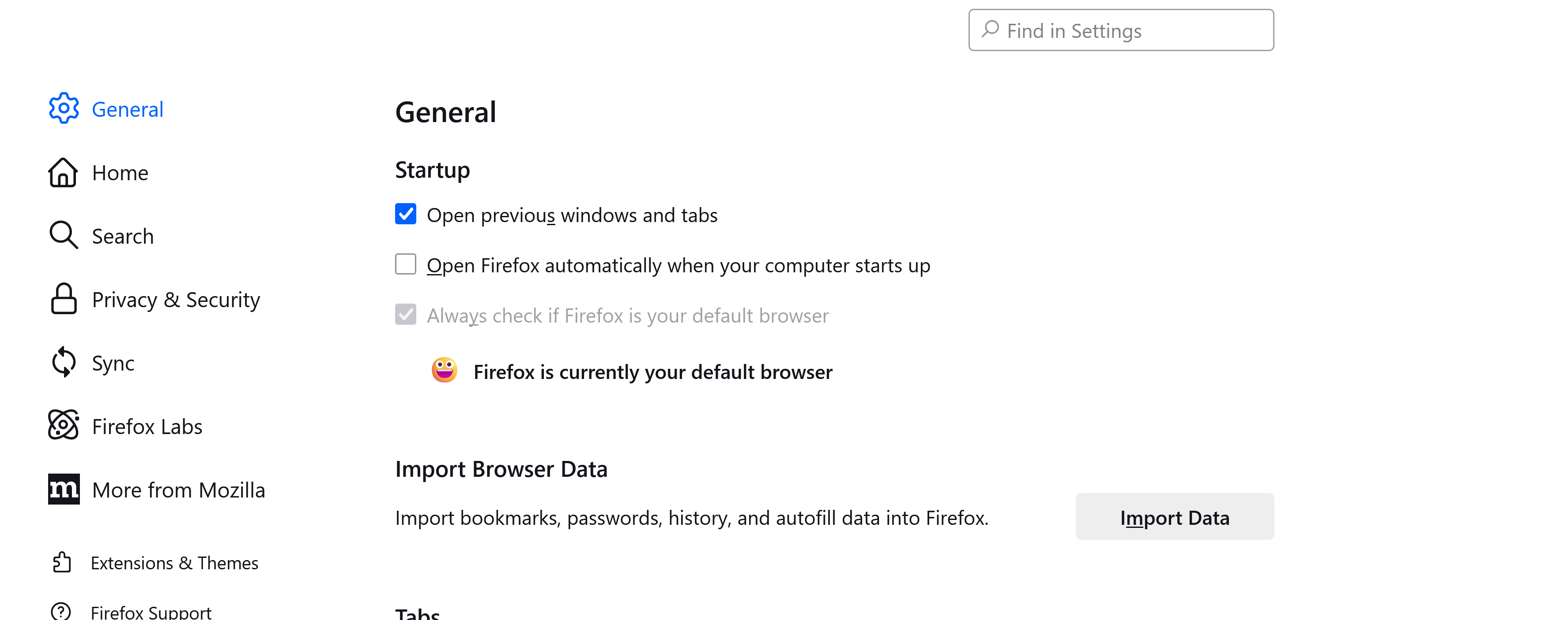 There are many tabs open in the firefox window. I'm closing the firefox. I'm opening it again.All tabs opened during the previous opening disappear.Either a new page or a single tab opens. The settings are set to "Open previous windows and tabs" (Image 1)