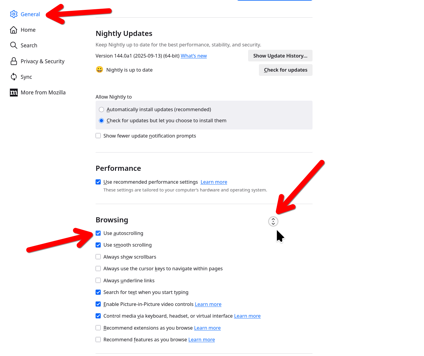 Hello! I just moved to Firefox a week ago and so far, I'm really happy I did. Nearly everything is better. That being said, there's one feature I used all the time on Chrome that I can't get working right here, and that's auto scroll. On Chrome, it worked no problem. When I clicked in the scroll wheel, it turned on auto scroll and would stay enabled until I clicked it again. One Firefox though, this isn't working right. When I click in the wheel here, it enables for a quick second before disabling itself. It's super annoying and makes it unusable. I found out it's because scrolling on the scroll wheel cancels auto scroll on Firefox, but not on chrome. So how do I make it so scrolling on the scroll wheel doesn't break auto scroll? Thanks in advance!