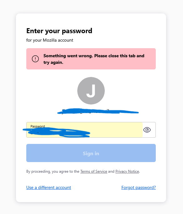 Was suddenly signed out and have been subsequently getting this error message "Something went wrong. Please close this tab and try again." when trying over and over to sign back in. Despite the error message, I still got email notifications and notifications on my other devices' Firefox that I've signed in successfully. What could be the issue?