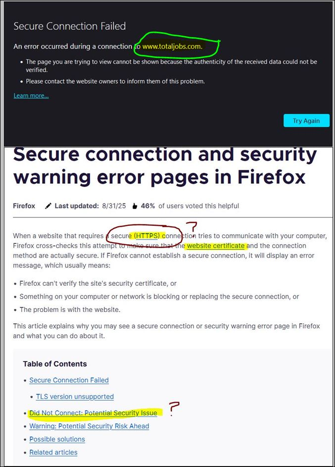 A Long trusted UK Based Job search site called Totaljobs is not loading since mid 2025, and 2 Firefox updates...