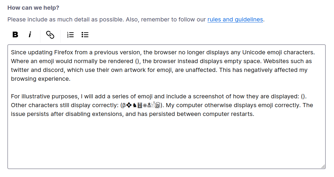 Since updating Firefox from a previous version, the browser no longer displays any Unicode emoji characters. Where an emoji would normally be rendered (👁️), the browser instead displays empty space. Websites such as twitter and discord, which use their own artwork for emoji, are unaffected. This has negatively affected my browsing experience.