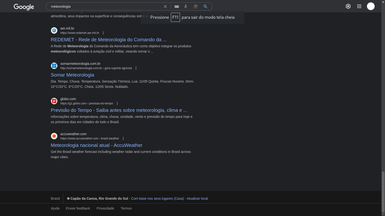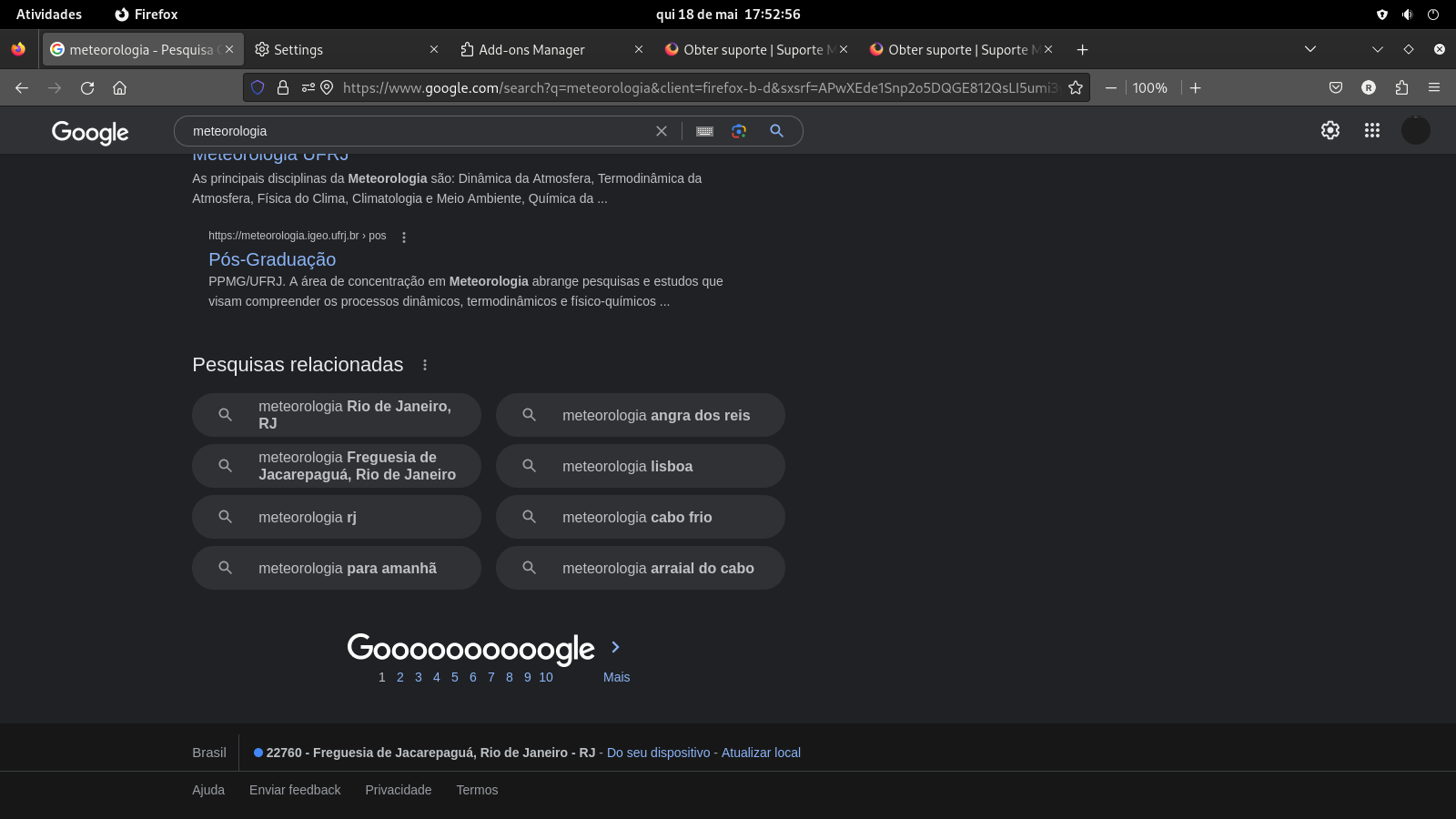 O navegador Firefox para desktop em S.O Fedora Linux WS 86/64 informa localização totalmente diferente da atual no rodapé da página de busca.