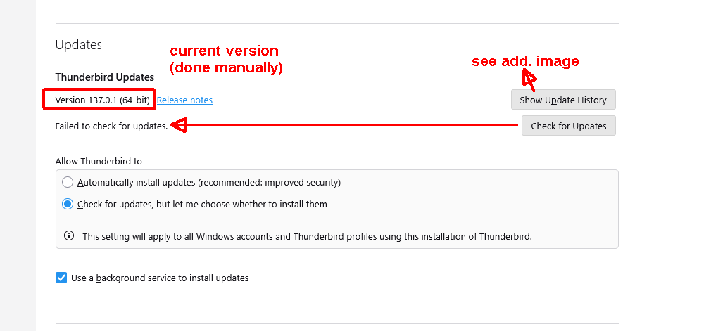 - manually updated to v137.0.1 .. nothing changed - other laptops (2) and desktops (3) within our company are still fine !!! .. no problem whatsoever .. - so problem is in my own desktop ! .. - Windows Defender, and Kaspersky AV, working together do not report any problem .. so : - (I have started to use Outlook 2019 .. with a clothespin on, but it works for the time being ..)