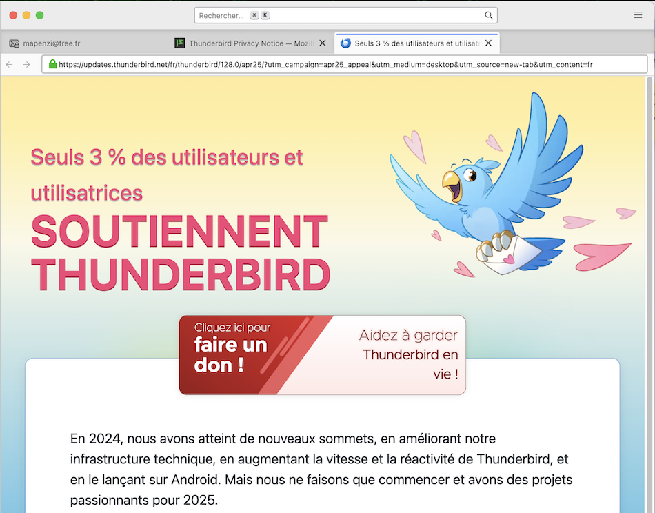 En effet après avoir lancé Thunderbird et créé un compte émail vous voyez apparaitre un onglet nommé "Seuls 3% des utilisateurs et utilisatrices SOUTIENNENT THUNDERBIRD". Il est vrai que la survie de Thunderbird dépend presque entièrement de dons des utilisatrices et des utilisateurs, d'où cette page information avec un appel aux dons. Mais vous n'êtes pas obligé de faire un don pour pouvoir utiliser ce logiciel gratuitement, et personne ne vous surveillera.