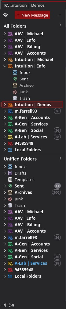 All inboxes show in the "All Folders" panel block, but when "Unified Folders" block is selected, the accounts prefixed "Intuition" fail to show in the panel. The Unified Inbox DOES receive mail from these hidden accounts, but this isn't really good enough as I need to be able to browse in to the folders within these accounts regularly.