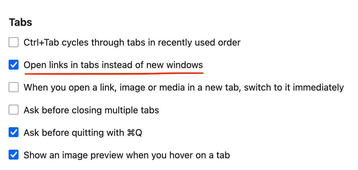 For some reason, though I have changed absolutely nothing with my browser, now any time a link is supposed to open automatically in a new tab, it opens in an entire new window. My mouse only has two buttons (Magic Mouse on Mac), so there is no way at all for this to be user error in that regard. The best example is in Gmail when you have multiple accounts signed in, you click the profile picture in the upper right and select a different account which then opens in a new tab. I notice that when I use a fresh profile the issue goes away, and migrating a copy of my existing profile between different Firefox versions (this profile I use in 115 ESR exclusively, I don't use it with more than one version, I just mean for testing purposes here), including forks like Waterfox, all are affected by this issue. Is there something in about:config I should look for to change?