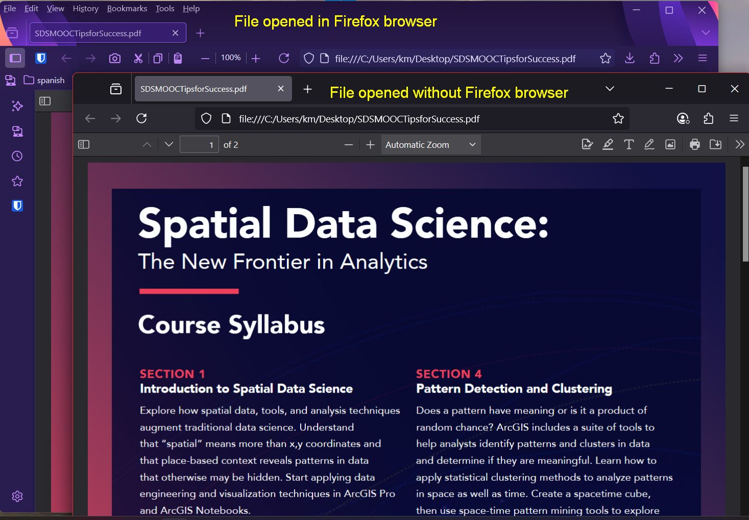 On the second PC. the usual Firefox browser icon is displayed. The type of file shown in properties for these is "PDF file."