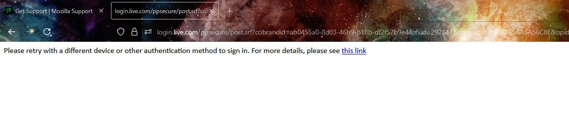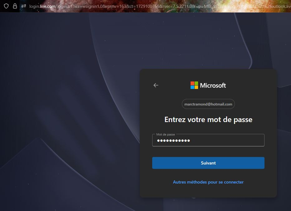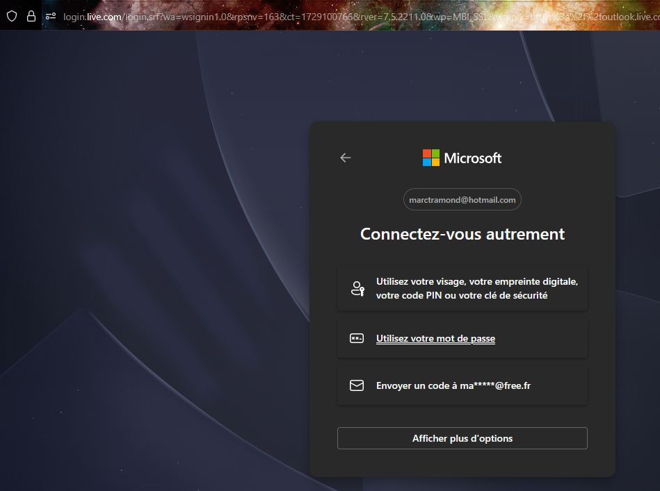 Bonjour, je ne peux plus me connecter à ma boite mail hotmail.com depuis la version 144.0.2 (64bits) de Firefox Je suis avec Windows 11 famille 64 bits - 24H2 et 25H2 (j'ai essayé avec les 2 versions) avec un compte local. Je choisis de me connecter avec un mot de passe et après avoir validé le mot de passe, j'arrive sur une page qui me dit d'utiliser un autre appareil ou une autre méthode de connexion. Je joins les fenêtres de connexion étape par étape Avec Google Chrome (que je ne veux pas utiliser), je me connecte sans problème à ma boite mail avec les même étapes décrites ci-dessus. Pouvez-vous m'apporter une solution ? Merci, Marc T.