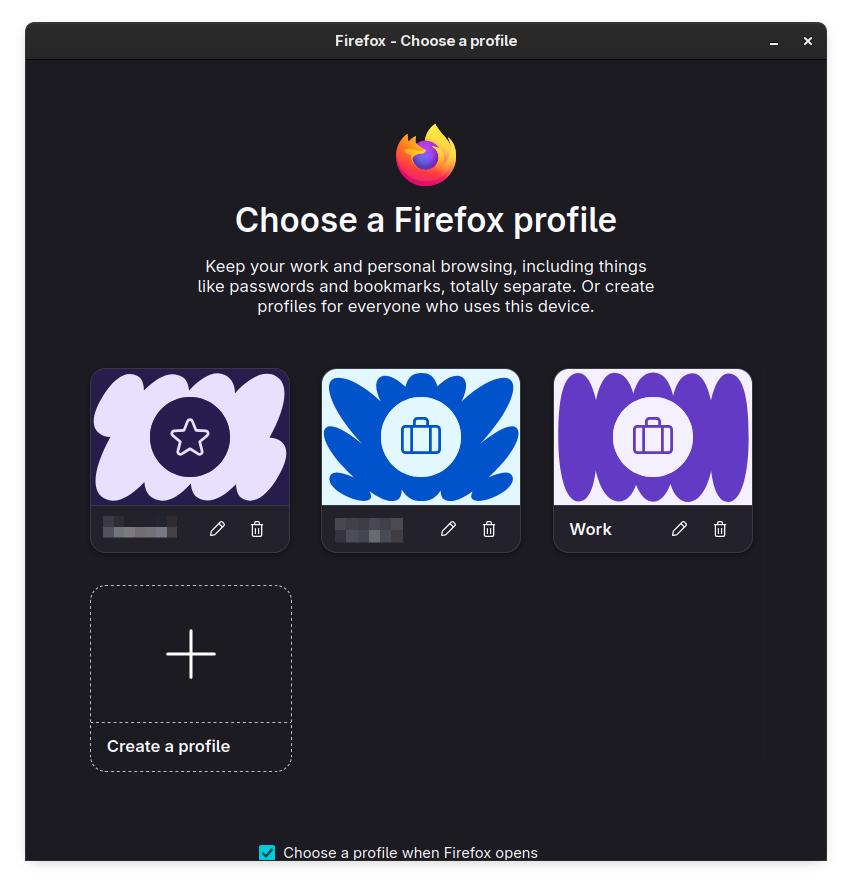 I already had two separate "old style" profiles, for personal and work browsing. I just created a new profile (from my "old" personal profile) using the new Profile Manager. I managed to import data from my "old" work profile to the new one. In this process, I ended up creating two new work profiles (with different names). Now, I simply cannot delete one of them. Clicking on the delete icon on the profile manager opens the new profile, and I understood I should see a confirmation dialog corresponding to the "about:deleteprofile" URL, but nothing is shown on this case. Also, this new browser instance doesn't show any profile management menu items.