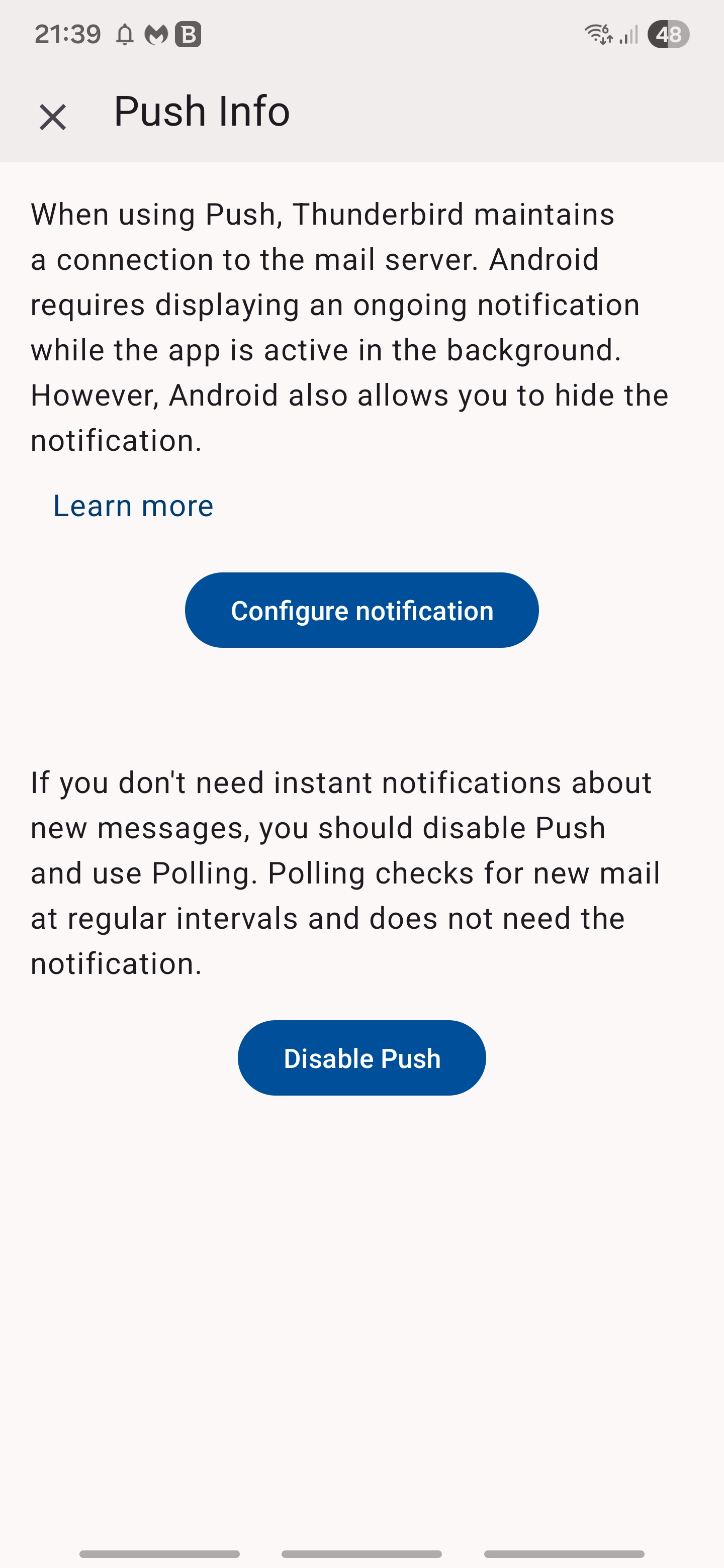 Thanks for your replies but I disagree with your reply to the Android technical restriction! Thunderbird was the last email client to inform me that I got a new email. FairEmail and Gmail notifications were given immediately