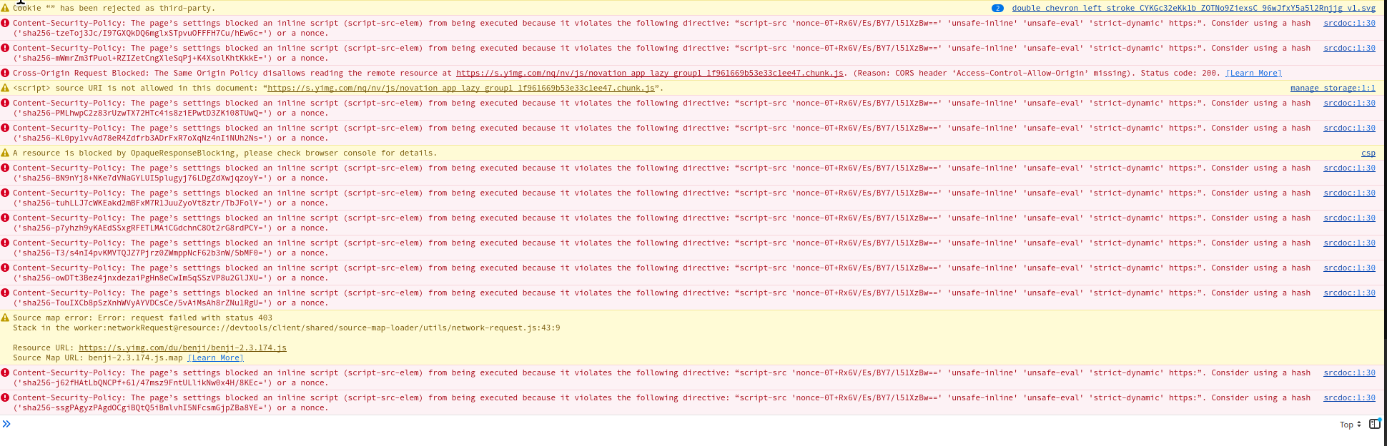 A resource is blocked by OpaqueResponseBlocking, please check browser console for details. csp Content-Security-Policy: The page’s settings blocked an inline script (script-src-elem) from being executed because it violates the following directive: “script-src 'nonce-0T+Rx6V/Es/BY7/l51XzBw==' 'unsafe-inline' 'unsafe-eval' 'strict-dynamic' https:”. Consider using a hash ('sha256-+IOJCD551Bk1jVTQf8C5357mTEwPzAWwaQr4FJKlwAY=') or a nonce. srcdoc:1:30 Content-Security-Policy: The page’s settings blocked an inline script (script-src-elem) from being executed because it violates the following directive: “script-src 'nonce-0T+Rx6V/Es/BY7/l51XzBw==' 'unsafe-inline' 'unsafe-eval' 'strict-dynamic' https:”. Consider using a hash ('sha256-QijpMZY0qFsiQJAYTDejwV0Fmegcwu6i3JC1N2dt08A=') or a nonce.