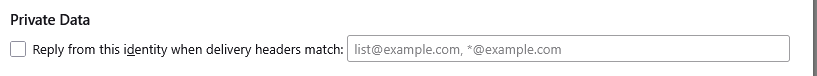 One last little thing... the secondary identity (identities) has the Email Address set to (e.g.) forwarded@gmail.com, but nothing else set except the Private Data line you show above checked so that "Reply from this identity when delivery headers match: forwarded@gmail.com" is set.