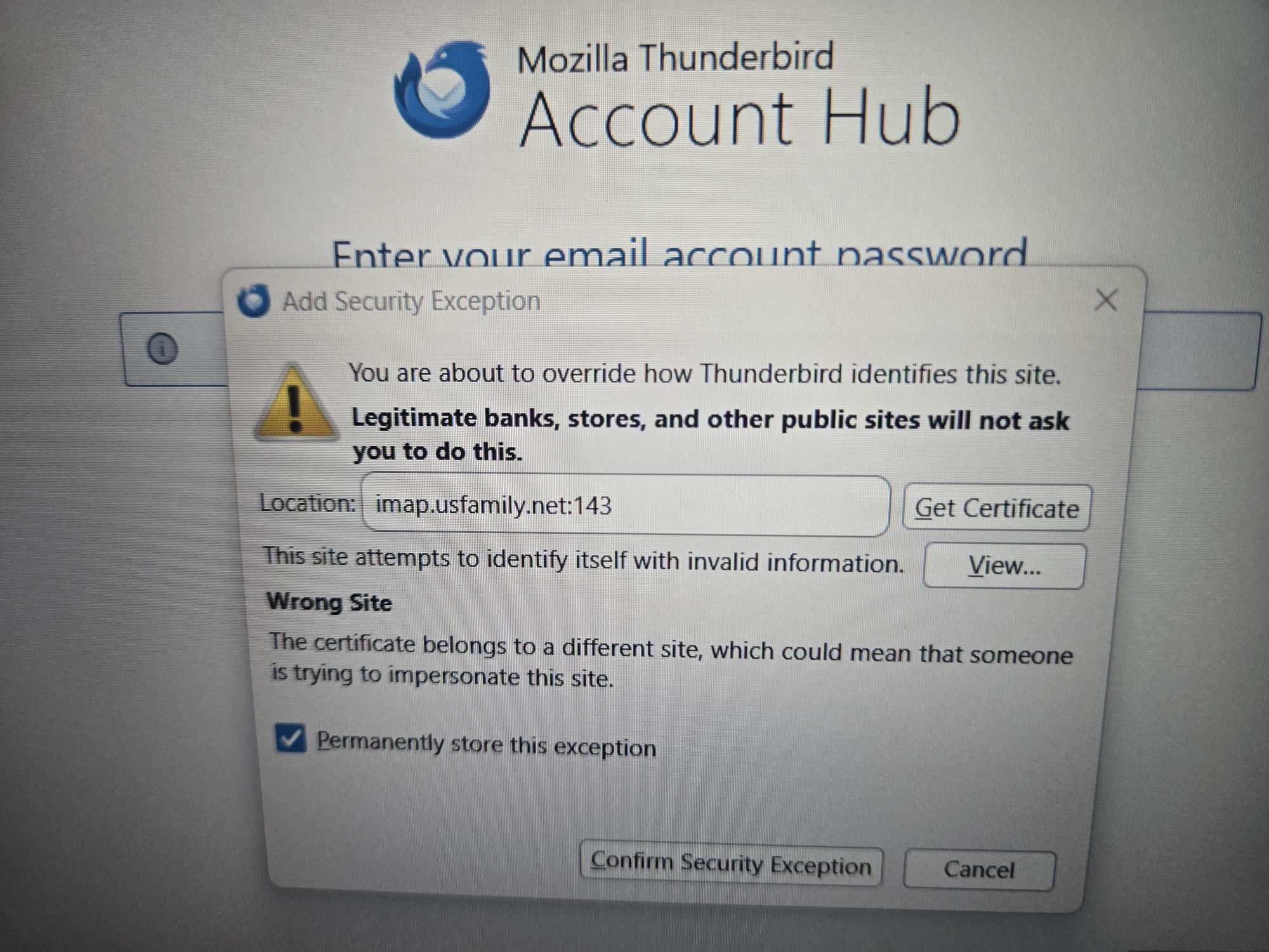We are loading Thunderbird and see the warning below in the Add Security Exception section. A rather daunting message. How should we proceed.